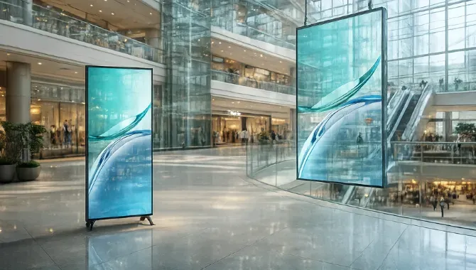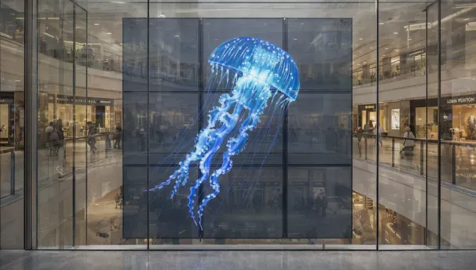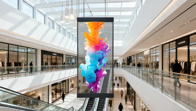 Holographic invisible LED screen with non-blocking visual effect Transparent LED display engineered for commercial spaces Modular design for shape and size flexibility Lightweight panels that reduce structural stress