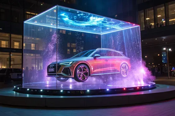 Holographic invisible LED screens create the illusion of floating images and interactive content.